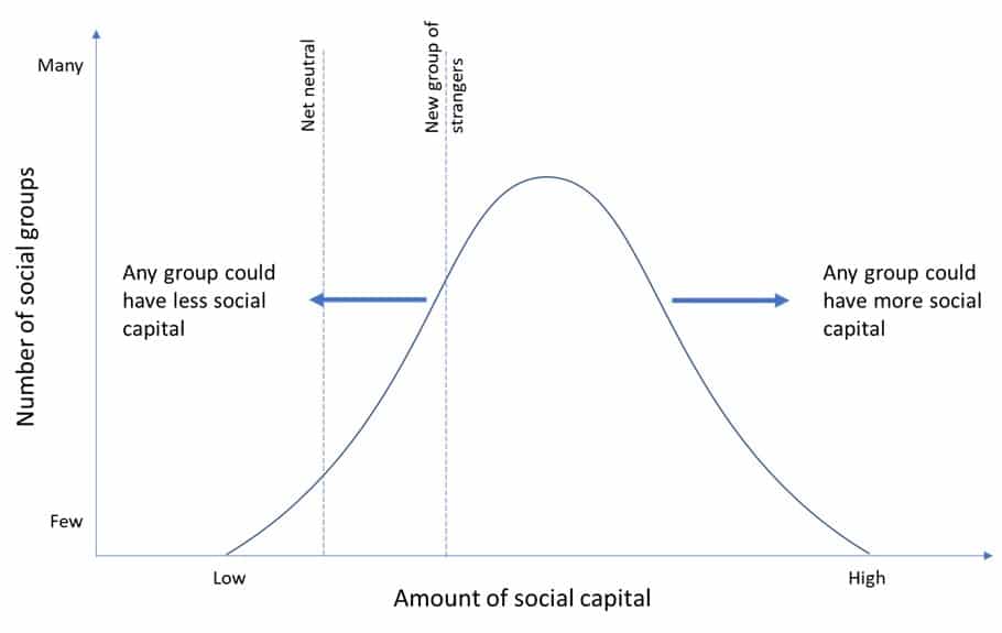 Most social groupings are likely to have normal levels of social capital, representing something approximating the normal distribution in Figure 6. Building on the idea that new groups have some social capital, I have added a line to indicate that in most societies, new groups would have a little less social capital than the average since we would expect most groups to improve their social capital from this starting point (although some groups may decrease from this starting point).