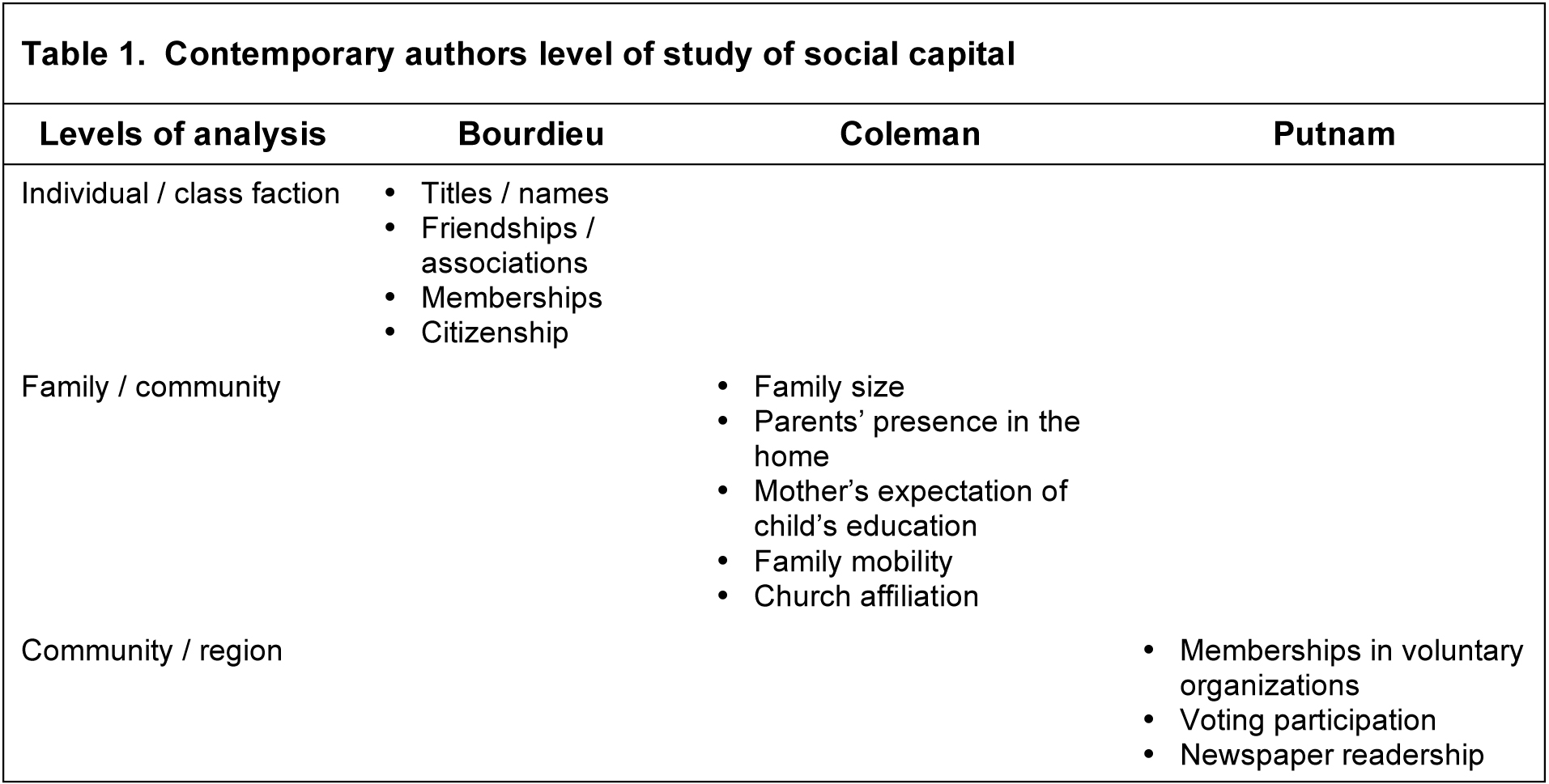 Tristian, I agree with Corry your synthesis of Social Capital theorist is enlightening. I am working on a literature review regarding social class and degree attainment. The table you use to describe the authors would be perfect for my review. Please let me if I can use Table 1. Contemporary authors level of study of social capital. If so I will cite you accordingly.