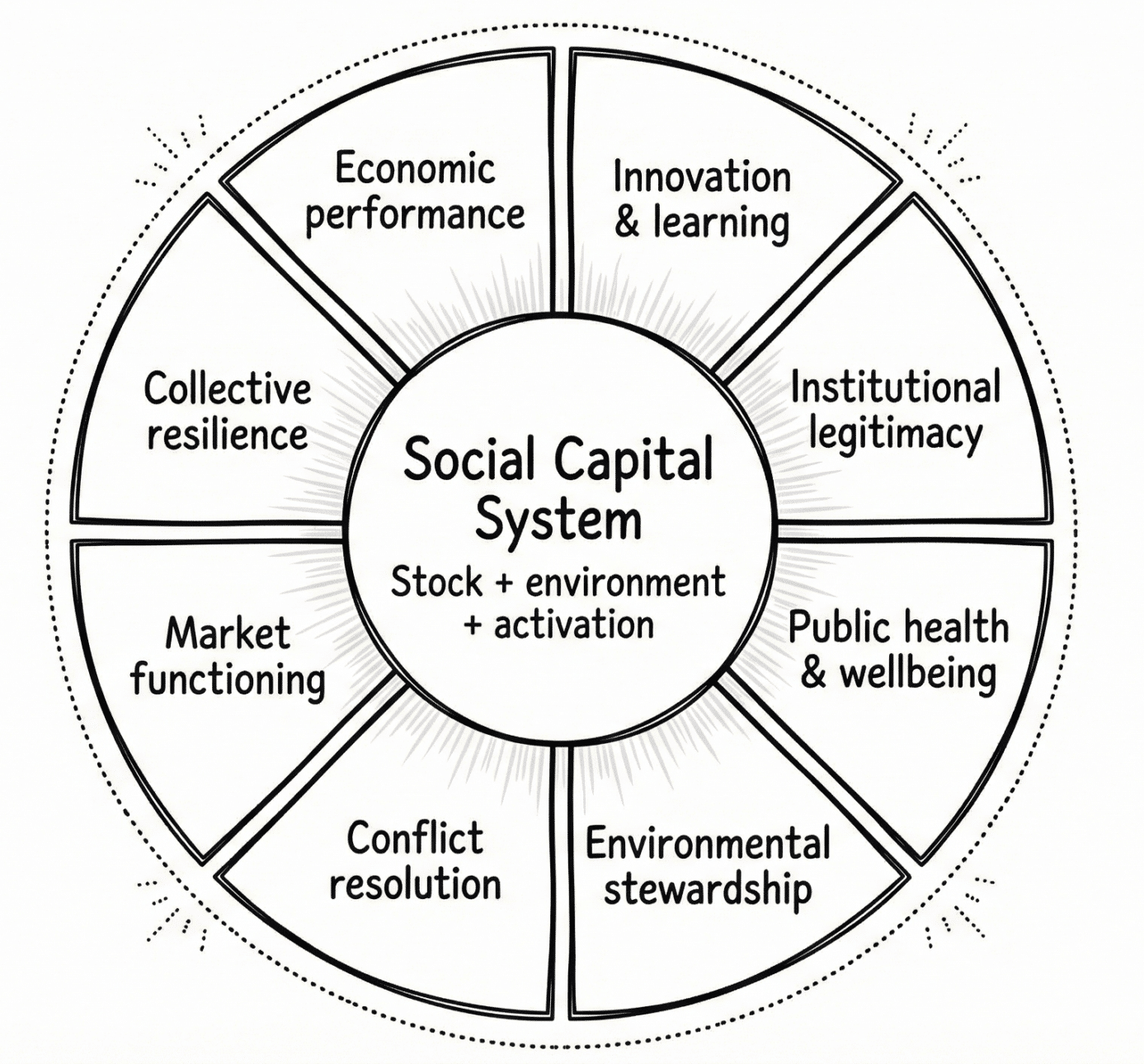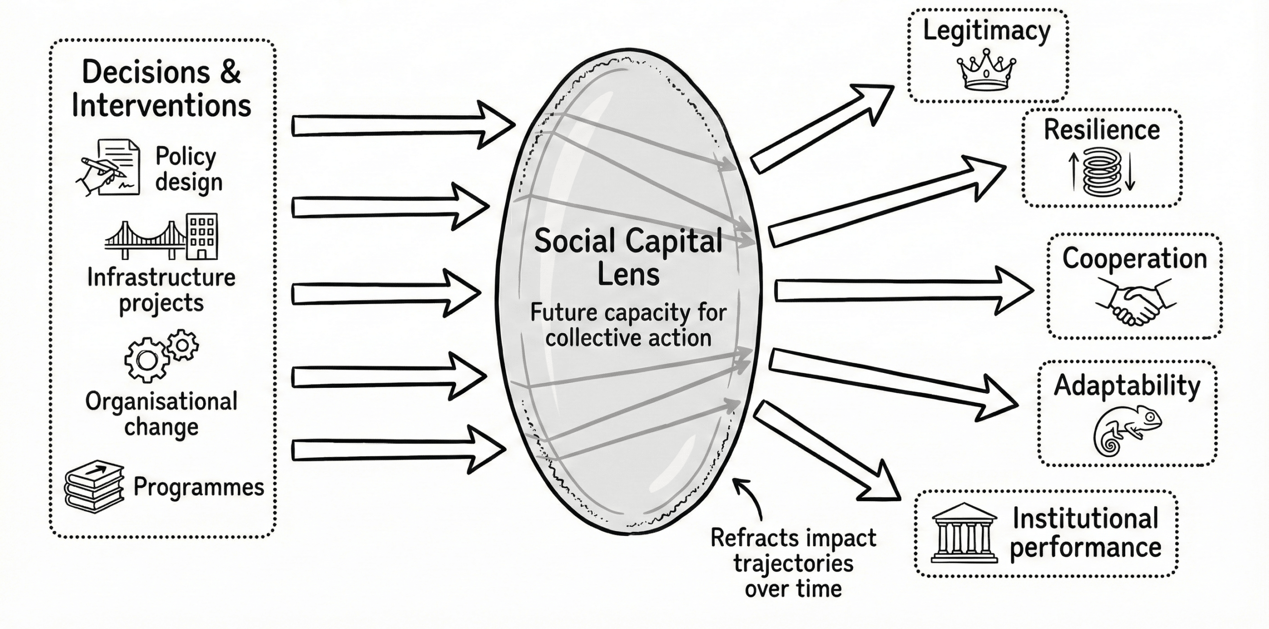 Treating social capital as a form of future capacity provides a way to make these conditions visible without redefining what matters. Rather than focusing solely on experienced social outcomes, the social capital lens draws attention to how decisions shape the underlying capacity that enables such outcomes to persist, scale, or adapt.