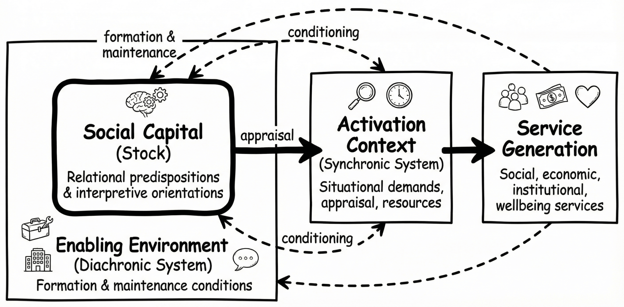 The final analytical task is to assess how changes to social capital stock, enabling environments, and activation contexts interact to affect the service-generation capacity of the social capital system as a whole. This capacity refers to the system’s ability to convert social capital into effective collective action across a range of situations and over time. It cannot be measured directly, nor reduced to a single indicator, because it reflects interaction effects rather than isolated attributes.