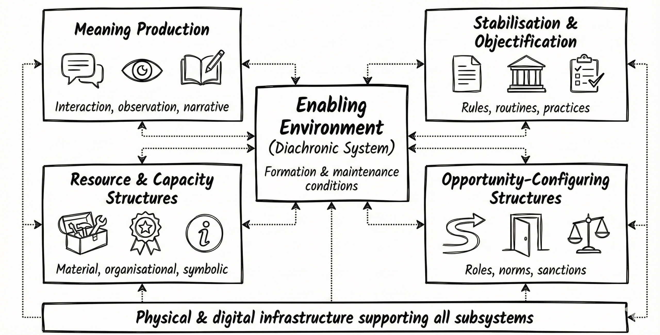 The enabling environment is assessed using methods that focus on durable conditions rather than states. Because it operates diachronically, shaping formation and maintenance over time, appropriate methods examine structures, practices, and experiential conditions that persist across situations.