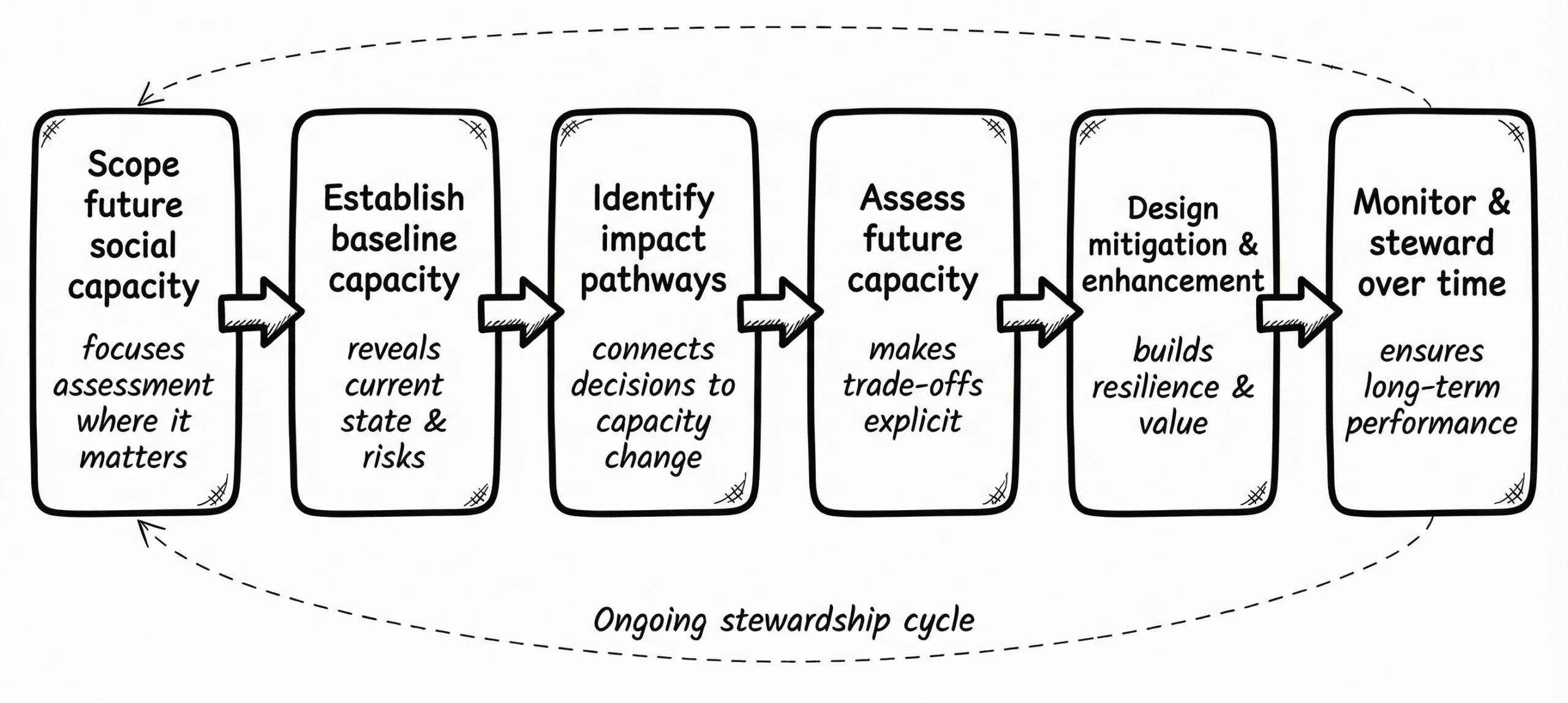 Across policy, infrastructure, organisational change, and community investment, social considerations are increasingly acknowledged but still commonly treated as immediate responses to manage rather than as sources of future capacity to be stewarded. As a result, impact assessment often emphasises short-term outcomes and observable behaviour, while the longer-term social conditions that shape ongoing viability remain implicit.