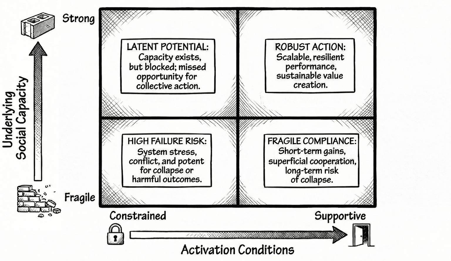 SCIA also improves diagnostic accuracy. In many settings, weak participation or visible resistance is interpreted as a lack of trust or social capital. SCIA enables a more precise diagnosis by distinguishing between thin or degraded social capital and situations where social capital exists but cannot be activated because contexts are hostile, risky, or resource-poor.