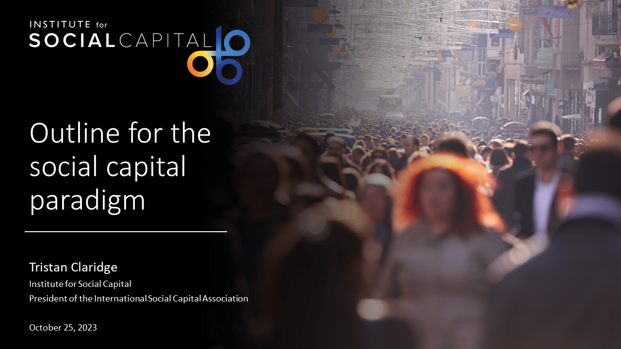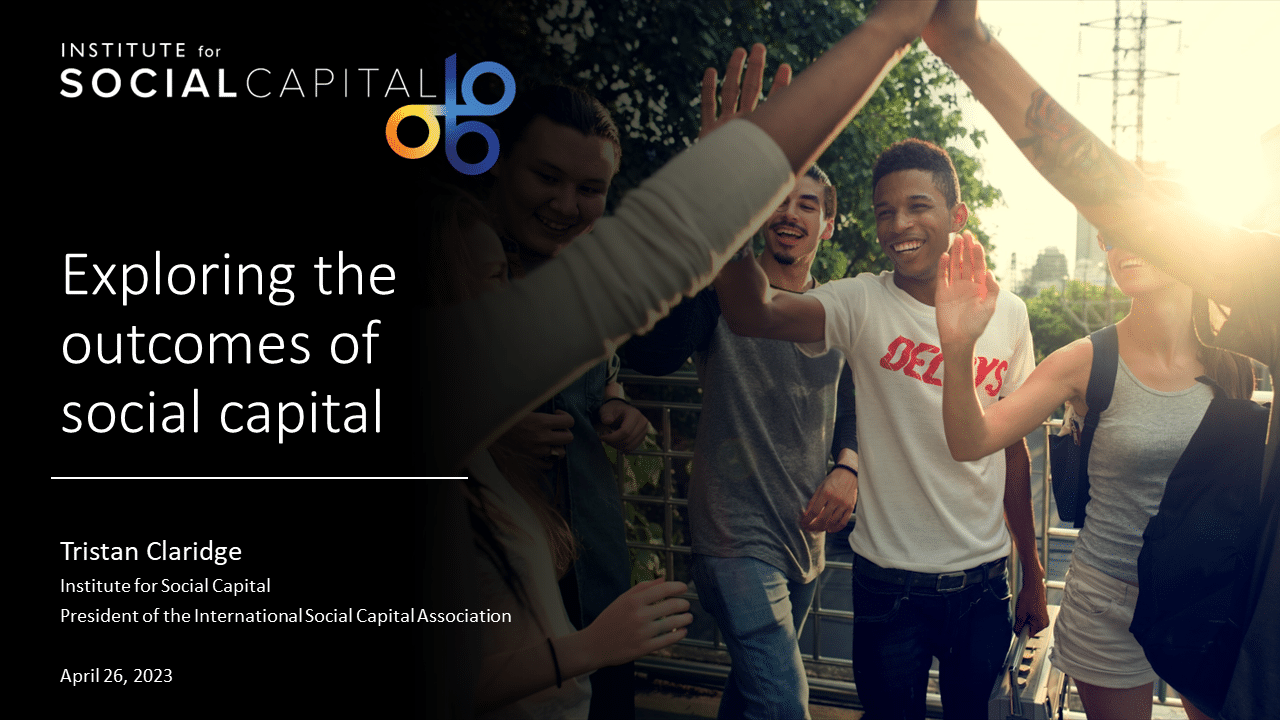 This webinar by Tristan Claridge from the Institute for Social Capital provides a general guide to the real-world application of social capital and the various ways the concept can be applied in practice. Social capital is vital for a wide range of contexts, from individual personal and professional success to organisational and group performance and community wellbeing, to name a few. This webinar goes beyond narrow academic definitions to outline a general approach capable of incorporating the complexity of social capital in a way that is easy to understand and apply to the real world. Every application of social capital is unique and requires a context-appropriate approach. Tristan will provide a framework for designing theory-informed practical applications of social capital and a brief description of the main ways social capital can be applied.