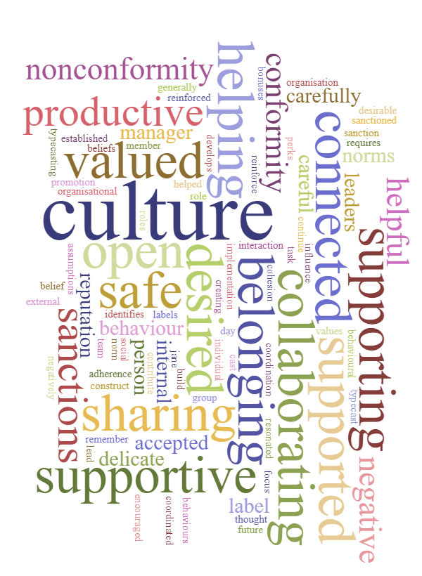 Behaviours can include those that are directly productive such as helping, supporting, sharing, and collaborating. Also important are behaviours that contribute to a positive social environment that indirectly improves productivity by creating a safe, open, supportive, connected culture where people feel valued, supported, empowered, and a strong sense of belonging.